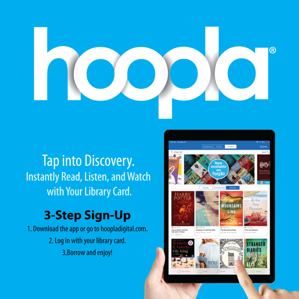 Borrow and enjoy audiobooks, eBooks, comics, movies, TV, magazines, or music everywhere you have a screen-your computer, your phone, your car, even your TV. All you need is a library card. hoopla syncs across all your devices, so you can stream titles immediately or whenever you’re in the mood. Most titles can also be downloaded to your phone or tablet. hoopla offers more content, in more places, than any other digital library platform and it’s all FREE thanks to your public library! Titles may vary based on library catalog.